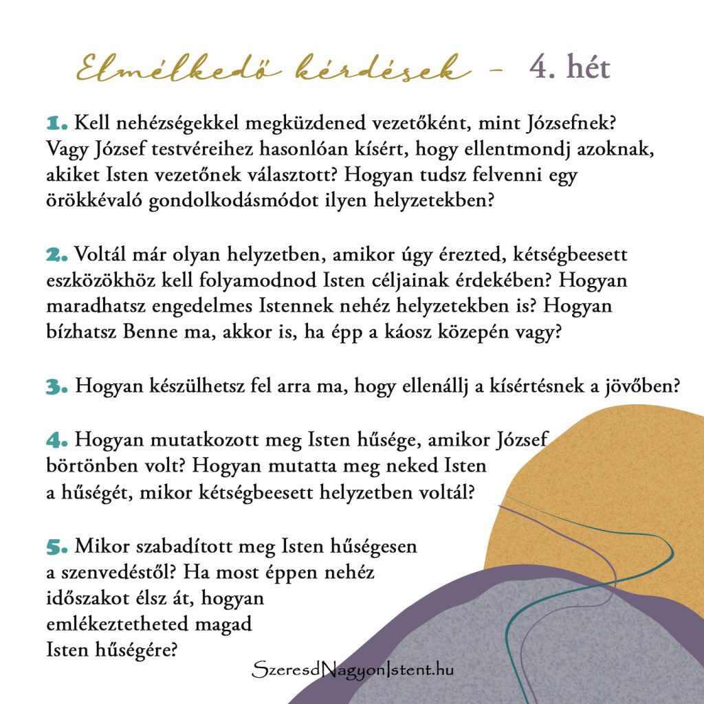 4. heti kihívás: Isten engedte, hogy József sokat szenvedjen azért, hogy az Ő isteni célja beteljesüljön. Miközben olvasod, jegyezd fel József szenvedéseit. Miután végére értél az eheti igerészeknek, vedd sorba még egyszer a szenvedések pillanatait, és gondold át, hogy Isten hogyan fordította jóra azokat. Elhiszed, hogy Isten a te életedben is tud így munkálkodni? Hogyan […]
