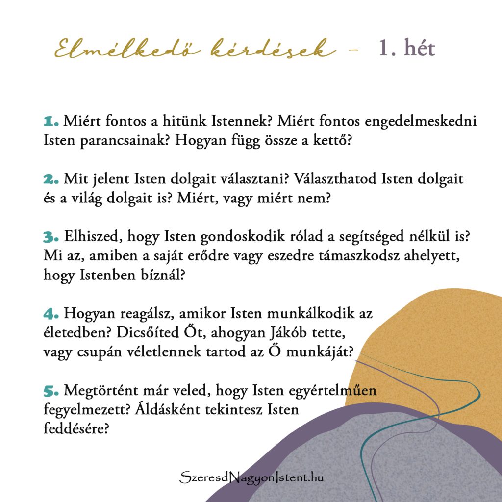 2. heti kihívás: Ezen a héten jegyezd fel Jákób életének főbb állomásait. Ezek a dolgok Jákób tervezgetései, vagy Isten vezetése miatt történtek? Jákób közbelépései vagy türelmetlensége milyen következményekkel jártak? Gondolkozz el azon, hogy te hogyan szoktál „segíteni” Istennek a céljai elérésében.
