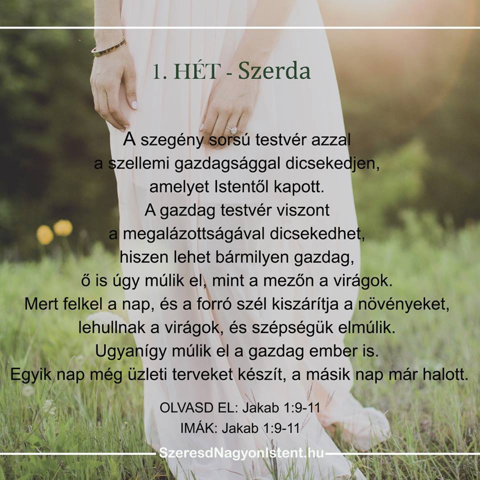 „A szegény sorsú testvér azzal a szellemi gazdagsággal dicsekedjen, amelyet Istentől kapott. A gazdag testvér viszont a megalázottságával dicsekedhet, hiszen lehet bármilyen gazdag, ő is úgy múlik el, mint a mezőn a virágok. Mert felkel a nap, és a forró szél kiszárítja a növényeket, lehullnak a virágok, és szépségük elmúlik. Ugyanígy múlik el a gazdag […]