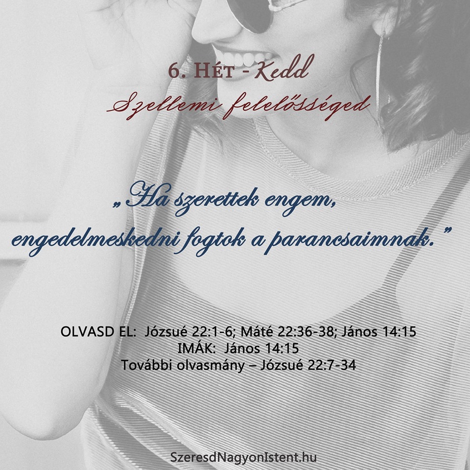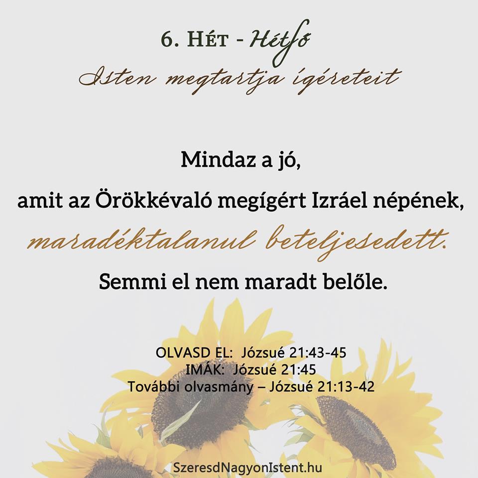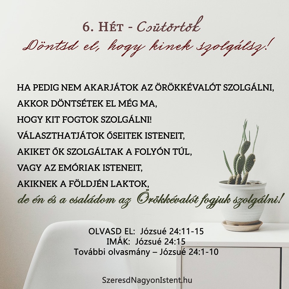 6. heti kihívás: Amint jelen – Járj győztesen! – tanulmányunk a végéhez közeledik, keresd meg az életedben azokat a lehetőségeket, melyekben napjaink Józsuéjává válhatsz. Hidd el Isten ígéreteit, légy erős és bátor azon a földön ahová helyezett az Ő terve szerint, és bízz Benne mikor a harcaiddal szembesülsz, mindig emlékezve arra, hogy sohasem harcolsz egyedül!