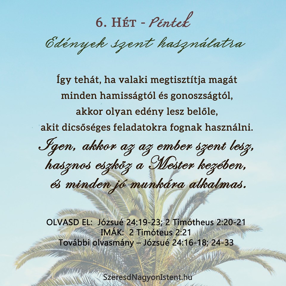 „Minden jó cselekedetre alkalmas…” – 2 Timótheus 2:21 Elérkeztünk a Józsué-tanulmány utolsó napjához. Ebben a szakaszban Józsuénak a néphez intézett utolsó beszédét olvashatjuk. Arra inti a népet, hogy hagyják el a bálványimádást, és kéri őket, hogy inkább Istent szolgálják. Emlékezteti őket, hogy ahhoz, hogy szolgálni tudják az Urat, szentnek kell lenniük. Mit is jelent ez? […]