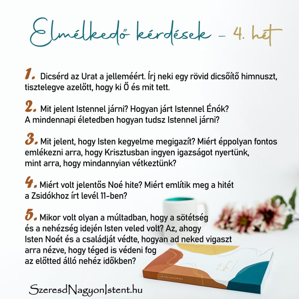4. heti kihívás: Azt a parancsot kaptuk, hogy mindenünkkel dicsőítsük az Urat. Ezen a héten szánj külön időt minden nap Isten dicséretére. Dicsérd Őt a jelleméért, nem csak azért, amit érted tett vagy neked adott. Hogy tudod Őt tisztelni ezen a héten?