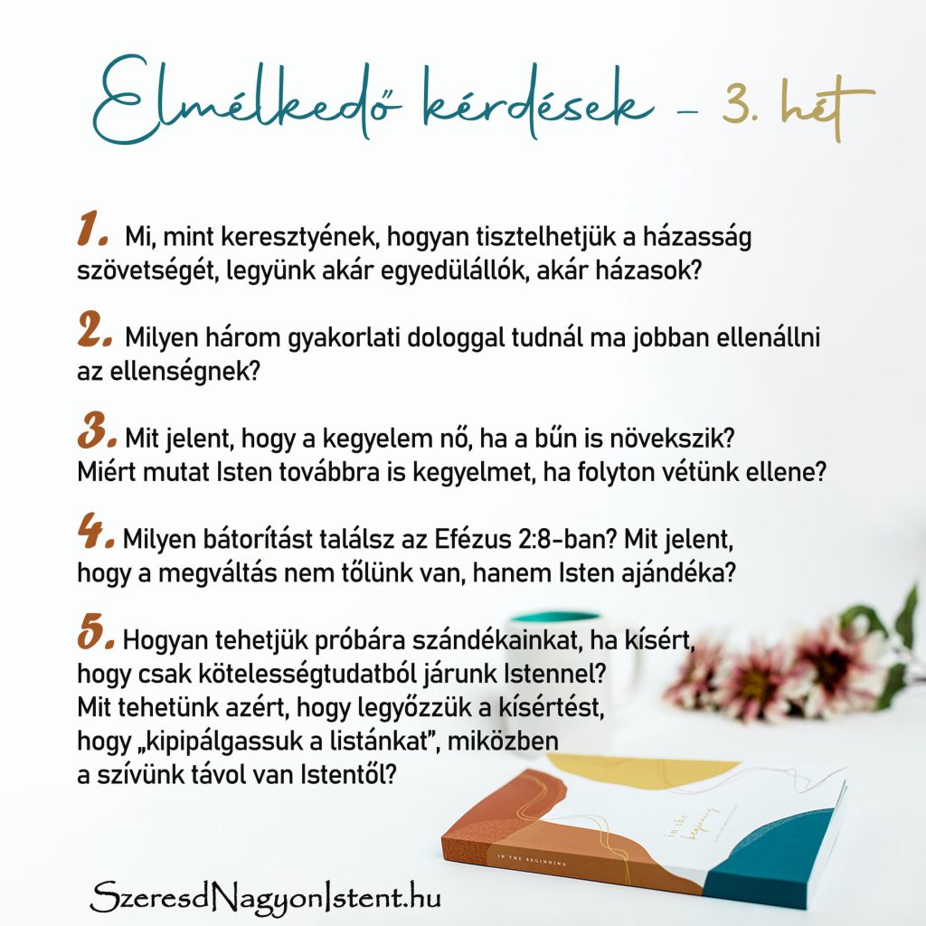 3. heti kihívás: A kígyó fogott valamit, amit Isten mondott Évának és kiforgatta azt. Megkérdőjeleztette vele Isten parancsát. Mit tehetünk azért, hogy legyőzzük az ellenség hazugságait? Sokszor suttog nekünk „féligazságokat”, amik miatt mi is kételkedni kezdünk Isten ígéreteiben és parancsaiban. Mivel verhetjük vissza ezeket a támadásokat, hogy szilárdan megmaradjunk a hitünkben és meggyőződéseinkben?
