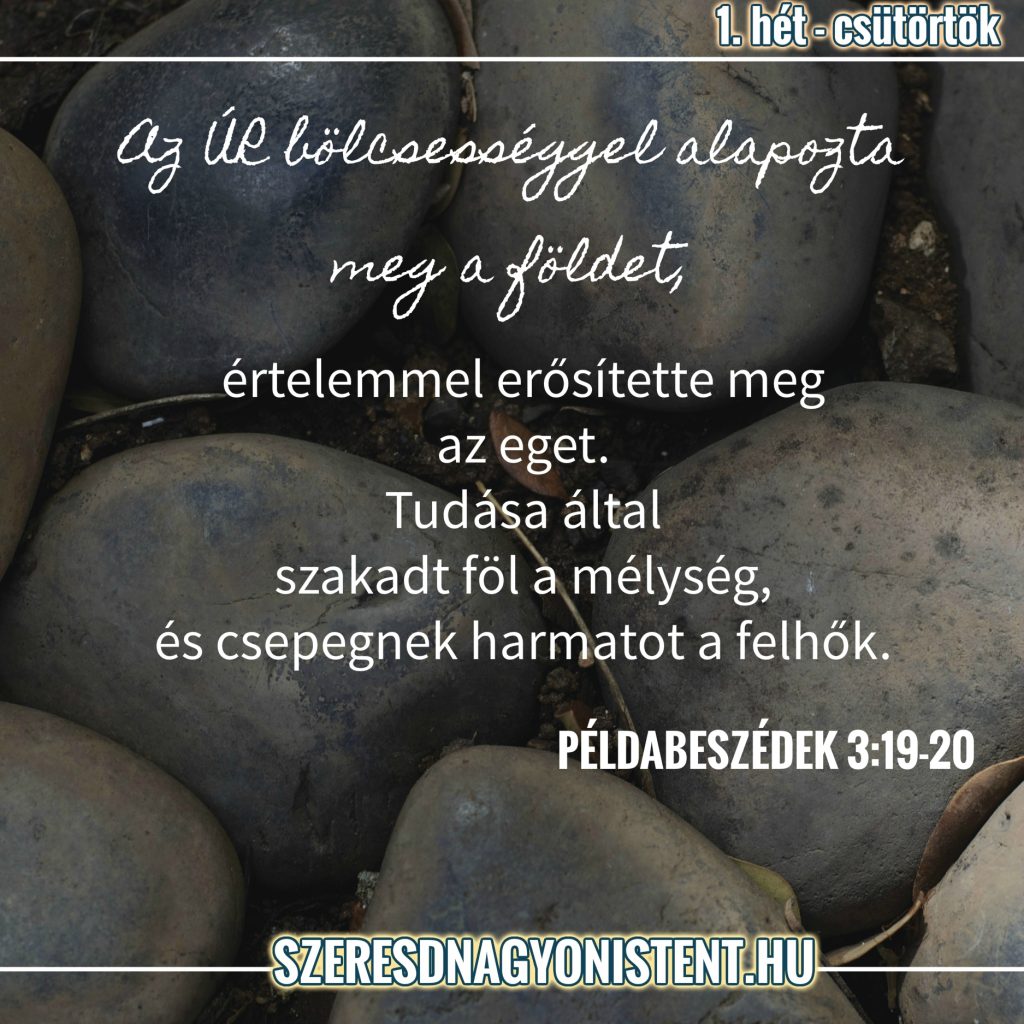 Olvasd el: “Az Úr bölcsességgel vetette meg a föld alapját, értelemmel erősítette meg az eget. Az ő tudása által váltak ketté a mélységes vizek, és harmatoznak a magas fellegek. Fiam, ne téveszd ezt szem elől, vigyázz arra, hogy okos és megfontolt légy! Ez élteti lelkedet, és ékesíti nyakadat. Utadon biztonságban jársz, és lábadat nem […]