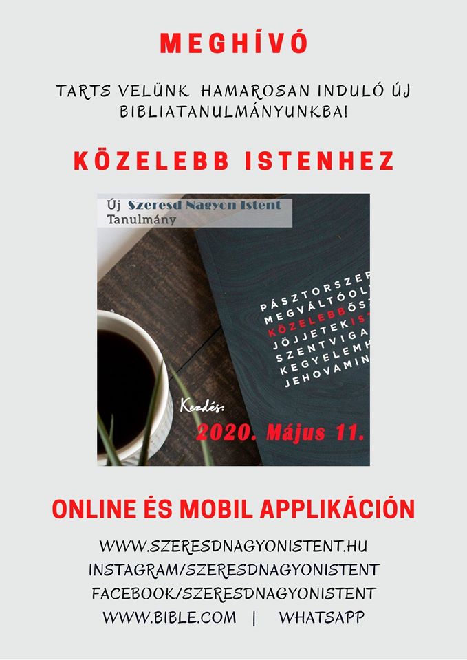 Szeretettel hívunk, hogy tanulmányozz ismét a Szeresd Nagyon Istent online női Bibliatanulmányozó szolgálattal! Új tanulmányunk címe: Közelebb Istenhez – Tanuljuk meg, hogyan tanulmányozzuk Isten Igéjét! Kezdés: 2020. május 11. (hétfő)Befejezés: 2020. június 21. (vasárnap)Tanulmányi idő: 6 hét „Isten Igéje egy mély bánya telis-tele kincsekkel és felbecsülhetetlen értékű drágakövekkel. Nem számít, milyen régóta tanulmányozzuk, mennyire ismerjük, […]