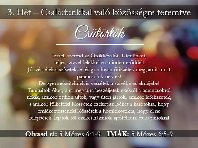 Mózes azt mondja az izraelitáknak, hogy ültessék el szívükben Isten parancsolatait, hogy kiáradjanak a gyermekeikre és unokáira is. Az izraeliták számára elhangzik, hogy szívük parancsait tanítsák a gyermekeiknek, folyamatosan beszélve arról a nap folyamán. A bibliai időkben az izraeliták a kezükre, homlokukra szalagozva írott igéket viseltek és az ajtófélfáikba vésték, hogy folyamatosan az Úrra emlékeztesse […]