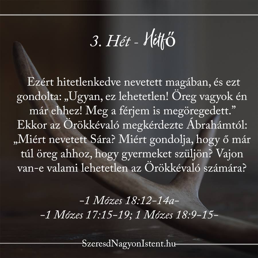 Ezen a héten a kihívás az, hogy tölts el hosszabb időt imádságban, és őszintén öntsd ki Isten előtt minden fájdalmadat, frusztráltságod, csalódásod és félelmed amellyel a meddőséghez viszonyulsz. Ha magad nem küzdesz ezzel, akkor járj közben valakiért, akiről tudod, hogy kétségbeesetten vágyakozik gyermek után de kitárt karjai üresek maradnak.