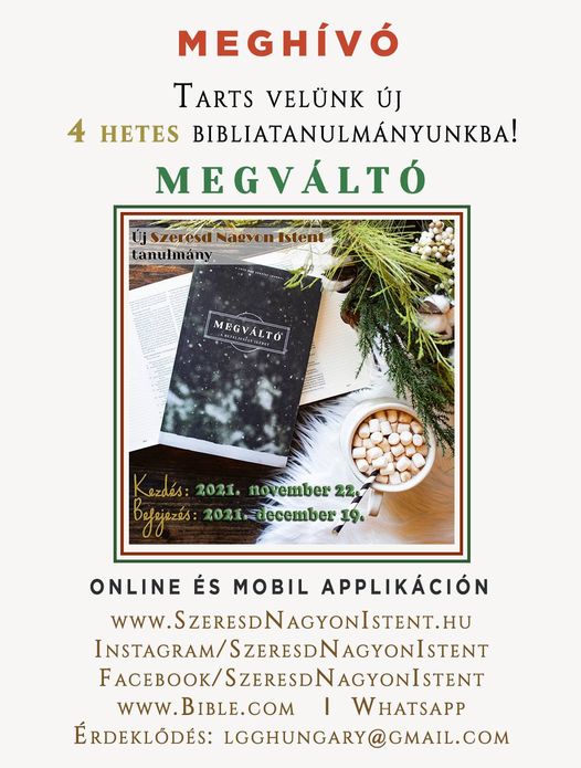 Szeretettel hívunk, hogy tanulmányozz ismét a Szeresd Nagyon Istent online női Bibliatanulmányozó szolgálattal! Új tanulmányunk címe: MegváltóKezdés: 2021. november 22. (hétfő)Befejezés: 2021. december 19. (vasárnap)Tanulmányi idő: 4 hét „A Karácsony nyomasztó időszak is lehet. Megpróbáljuk átérezni az ünnep örömét, de a tennivalók hosszú listája és a szoros időbeosztás miatt kimerülünk, s szinte vánszorogva érünk oda […]