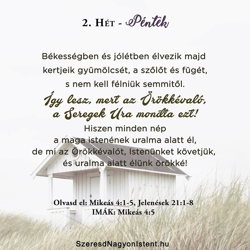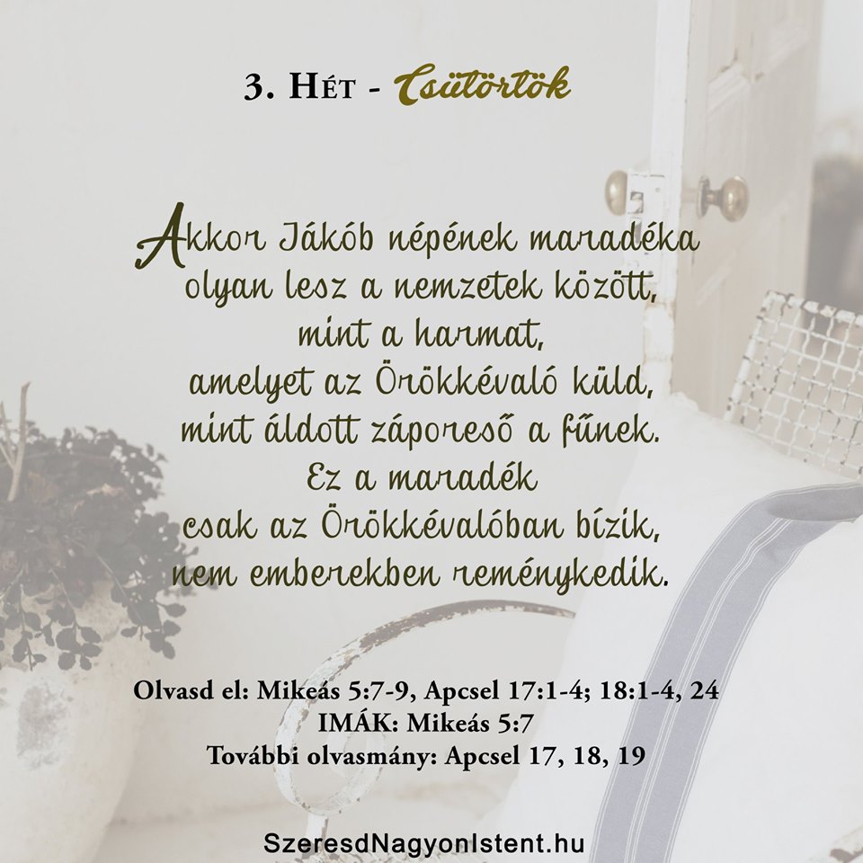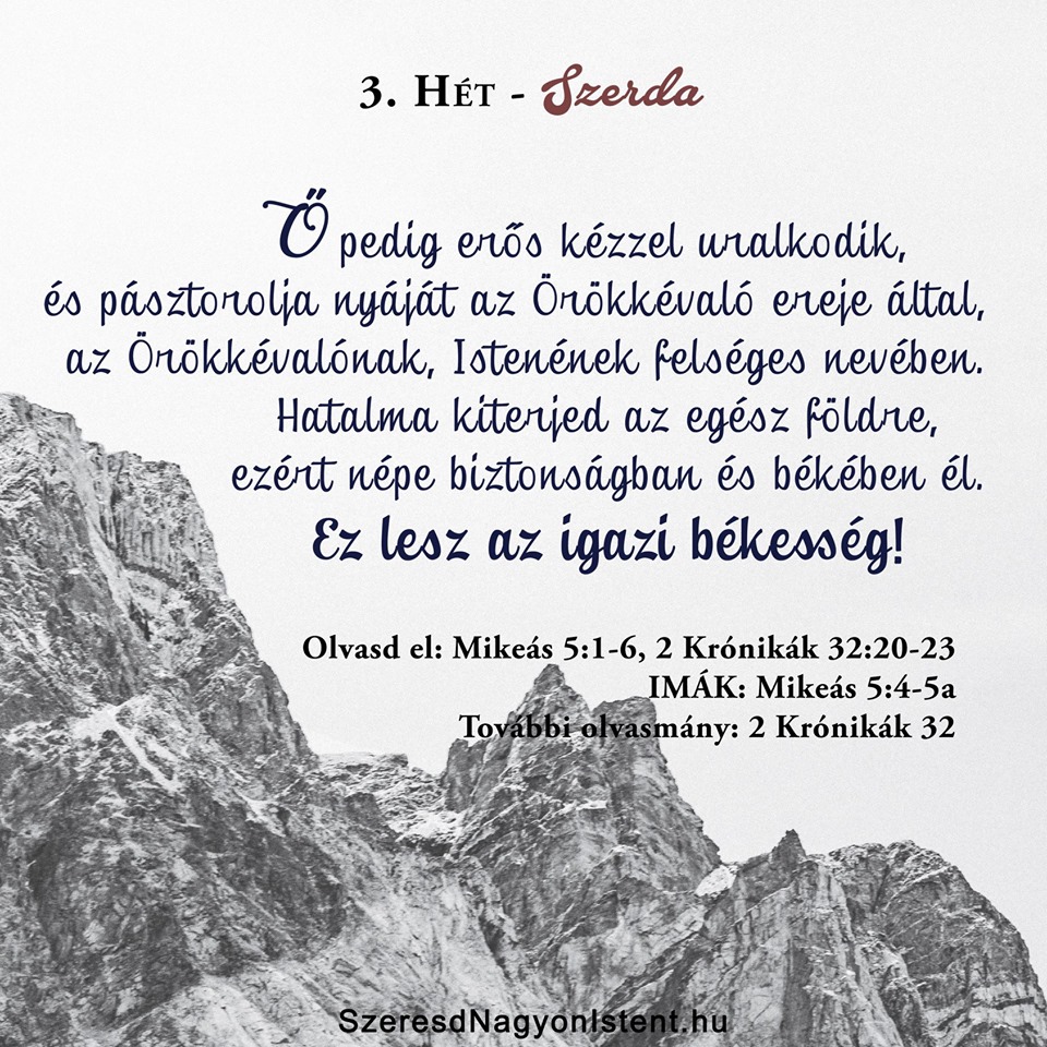 Olvasd el: Mikeás 5:1-6, 2 Krónikák 32:20-23 IMÁK: Mikeás 5:4-5a További olvasmány: 2 Krónikák 32 Az első versben Mikeás előretekint az időben és megjövendöli Jeruzsálem ostromát. Jeruzsálemet „seregek leányának” nevezi, mert látja, hogy milyen nagy létszámú sereg, milyen sok katona fogja támadni a Szent Várost. Isten Babilónia erős seregeit használja arra, hogy beteljesítse ítéletét Júda […]