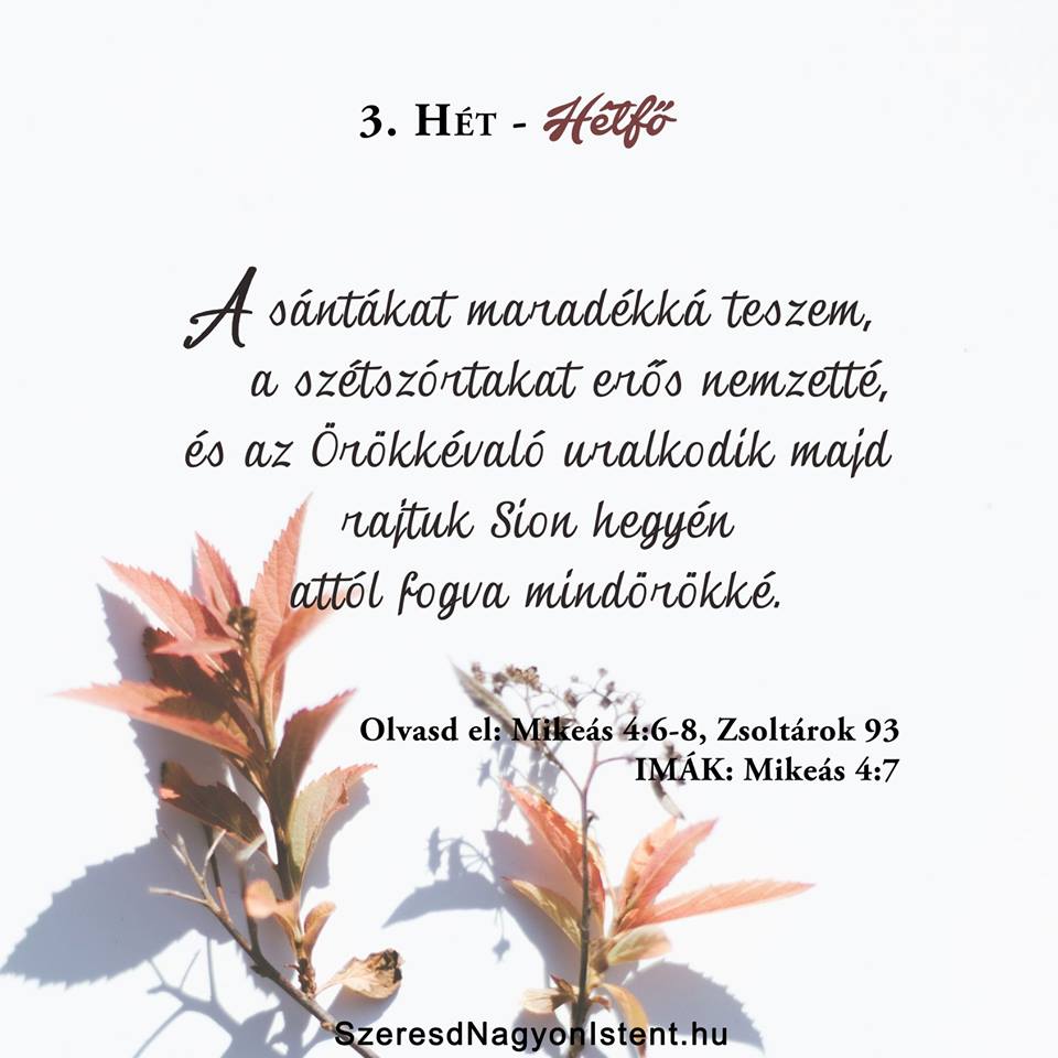 Olvasd el: Mikeás 4:6-8, Zsoltárok 93 IMÁK: Mikeás 4:7 Szeretem, ahogyan Isten azokat is észben tartja, akiken mi átsiklanánk. Isten Királyságában azok, akiknek a világ mértéke szerint nincs lehetőségük a sikerre, kiemelt helyet kapnak az asztalnál. Nem számít, hogy a zsidók maradéka milyen gyenge, milyen kicsiny. Isten újra erőssé teszi őket, amikor Jézus, mint Király […]