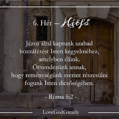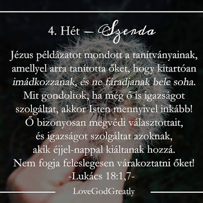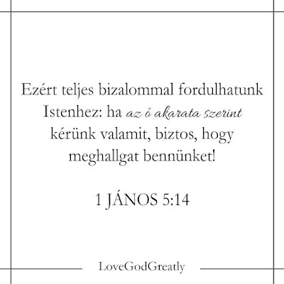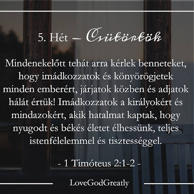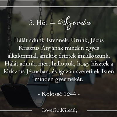 Megtanulandó Igevers: Heti imatéma: Szánj időt rá, hogy megköszönd Istennek, ahogyan dolgozik az életedben. Heti kihívás: A tanulmányozó füzetedbe, vagy egy külön papírra írj le egy imát Istenhez, köszönd meg, hogy közvetlenül fordulhatsz hozzá Jézuson keresztül.