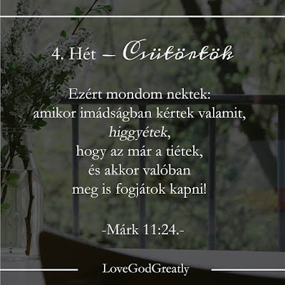 “Istenben bízz minden időben, népem! Öntsétek ki szíveteket előtte! Isten a mi menedékünk és biztonságunk!” Zsoltárok 62:8 Köszöntelek az Imádság Tanulmányunk 4. hetében. Mielőtt bele mennénk a hétfői versekbe, szeretném elmondani, milyen büszke vagyok rátok, amiért átküzdöttétek magatokat a múlt pénteki nehéz verseken. Nem vagyok egy érzelmes ember, de nagyon izgatott leszek, amikor látom, hogy […]