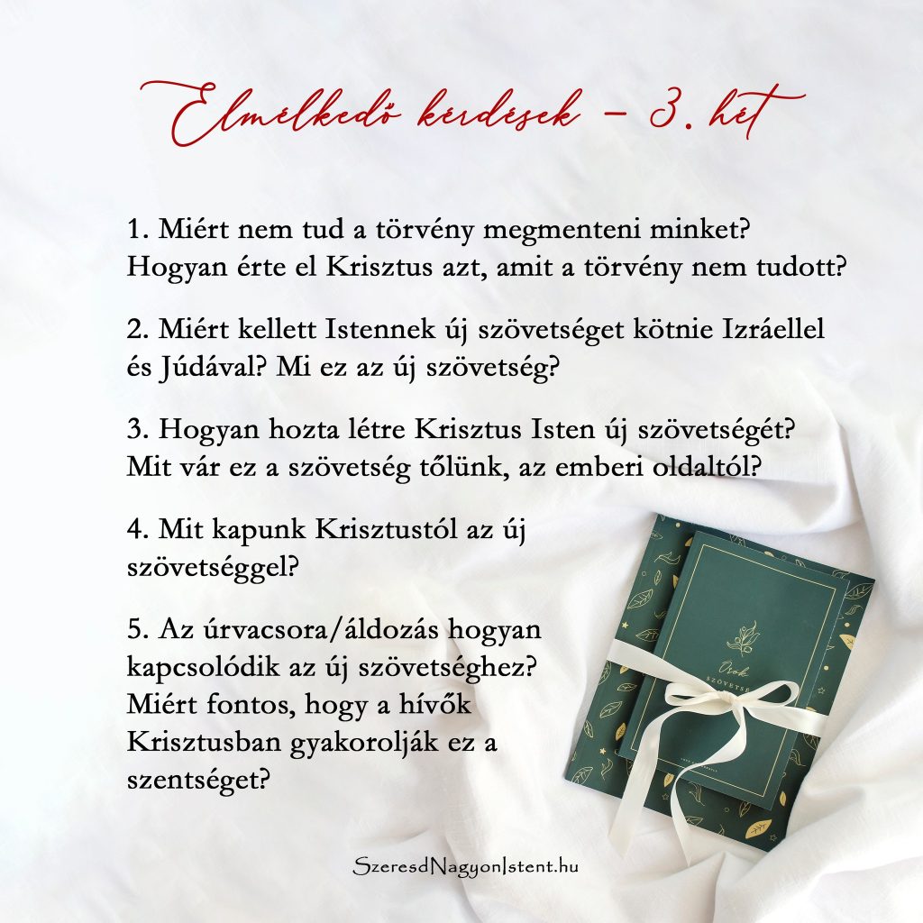 3. heti kihívás: Milyen módon vált az életed a „törvény követőjévé”? Van olyan területe az életednek, ahol már inkább szőrszálhasogatóként gondolkozol? Ezen a héten gondolkodj el azon, hogyan mutatja meg Isten tetteidtől függetlenül az irántad való hűségét! Miképpen léphetsz előre, és hagyhatsz fel a jog-, vagy munkaalapú mentalitással az életedben és az Istennel való kapcsolatodban?