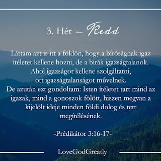 Olvasd: Préd. 3:9-15 IMÁK: Préd. 3:14-15 Salamon arra a következtetésre jut, hogy Isten helyezte el az Örökkévalóságot az ember szívébe és csak Ő képes kielégíteni ezt a vágyát. Visszaemlékszik, hogy Isten szent és tisztelni kell Őt hatalmas erejéért és nagyságáért. Azt ajánlja, hogy az ember örüljön minden áldásnak, amit Istentől kap, mert minden ajándék Tőle van. Attól […]