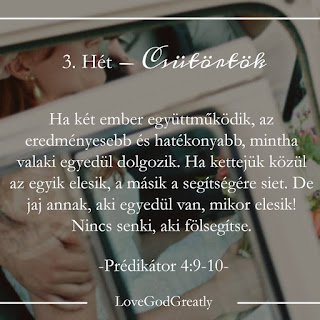 Olvasd: Préd. 4:7-12 IMÁK: Préd. 4:9-10 Salamon megosztja velünk, hogy milyen áldás az, ha vannak barátaink – van társaságunk, partnerünk, védelmünk, elszámolhatóak vagyunk és támogatnak minket. Hatalmas erő van ott, ahol két ember egyesül. Salamon azt is megosztja velünk, hogy a hármas kötél nem szakad el könnyen. Isten képezi a harmadik részt ebben a hármas kötélben. Istennel […]