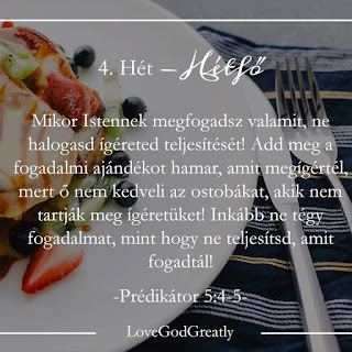 Olvasd: Préd. 5:1-7 IMÁK: Préd. 5:4-5 Salamon beszél arról, mennyire fontos tisztelni és imádni Istent. Cselekedeteinkben és beszédünkben is tisztességet kell adjunk Istennek. Azok, akik félik Őt, nem fognak elhamarkodottan esküdni és az ígéreteiket pedig komolyan fogják venni. Isten szent és abszolút tökéletes. A hívők szentsége egyedül abból a helyes kapcsolatból ered – ami Isten és közöttük […]
