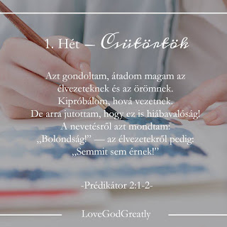Olvasd el: Prédikátor 1:7-11 IMÁK: Prédikátor 1:9-10 Salamon ezt az életet unalmasnak és ismétlődőnek mutatja be nekünk. Kutatta a lehetőségeket, hogy némi tapasztalatot, vagy örömet szerezzen magának, hogy megtalálja élete értelmét. Úgy írja le ezt a világot és mindent amit nyújtani tud mint életet “a nap alatt”. Felfedezte, hogy minden tapasztalat Isten nélkül ugyanazt az eredményt […]