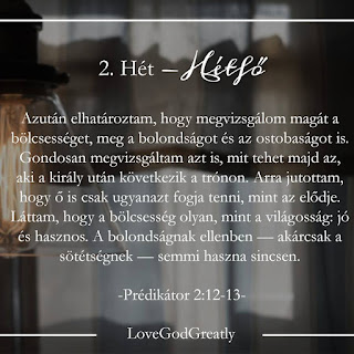 Olvasd: Préd. 2:12-17 IMÁK: Préd. 2:12-13 Salamon összehasonlítja a bölcsesség követését az élvezetek és feltevések követésével és arra a következtetésre jut, hogy a bölcsesség követése jobb. Ugyanakkor azt állítja, hogy a bölcsesség-keresőkre és az öröm-keresőkre is ugyanaz a földi sors vár: a halál. Salamon átmenetileg elvesztette a szeme elől azt a tényt, hogy a halál a földön […]