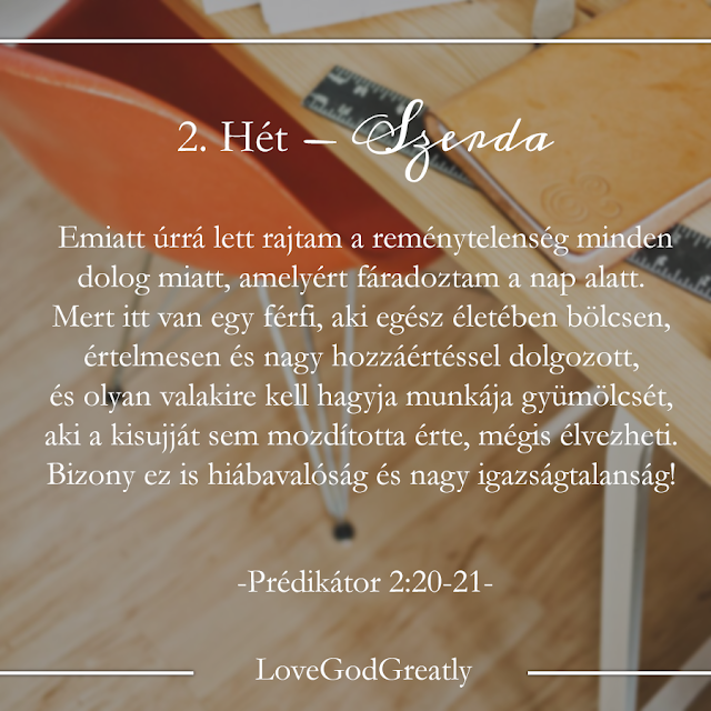 Olvasd: Préd. 2:20-23 IMÁK: Préd. 2:20-21 Salamon végül felismeri, hogy semmire sem támaszkodhat ezen a földön, ami teljes mértékben kielégítette a vágyait – mert minden hiábavaló. Minden elért földi siker – Isten nélkül – csak fájdalomhoz, bánathoz és álmatlan éjszakákhoz vezet. Abban az időben Salamon úgy döntött, hogy kétségbeesés és szánalom helyett kiált Istenhez, hogy […]