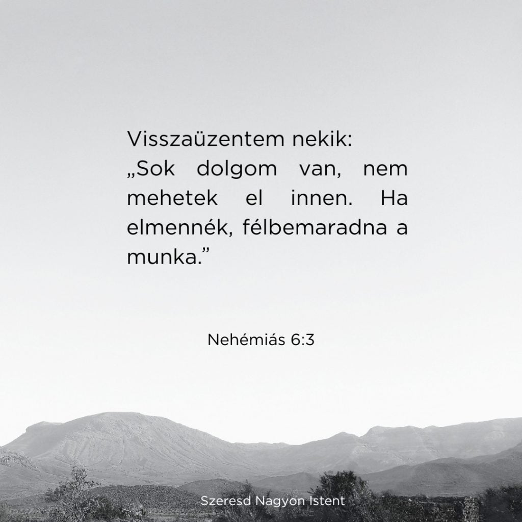 3. heti kihívás: Nehémiást nem tántorította el, hogy ellenségei megpróbálták eltéríteni és lejáratni őt. Mit tehetsz, hogy továbbra is az Istentől kapott feladatra összpontosíts? Ezen a héten szánj időt Isten Igéjének megértésére, és keresd Őt konkrét útmutatásért. Igéjének ismerete az egyetlen módja annak, hogy biztosak lehessünk abban, hogy amit kérnek tőlünk, az Tőle származik-e.