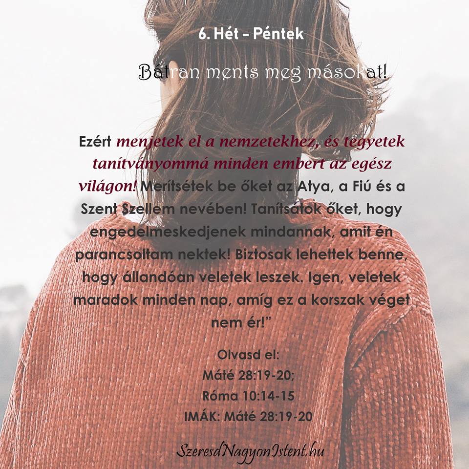 6. heti kihívás: Ezen a héten szánj rá időt és nézd végig az időbeosztásod. Hogyan keresed először szándékosan Isten királyságát? Írd le a naplóba, oszd meg a csoporttársaiddal, esetleg még a tükrödre is kiragaszthatod, hogy mikor elolvasod eszedbe jusson reggelente. Gyertek, legyünk bátrak és céltudatosak abban, amit el szeretnénk érni, a lehető legjobban kihasználva minden […]