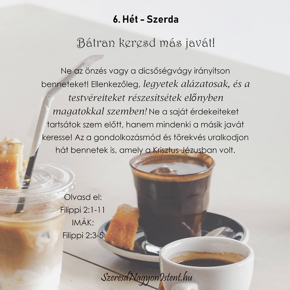 Bátran keresd más javát Olvasd el: Filippi 2:1-11 IMÁK: Filippi 2:3-5 Másokat magunk elé helyezni bátor cselekedet. Talán nem tűnik annak, de másokat előrébb helyezni azt jelenti, hogy leszámolunk a büszkeségünkkel, megalázzuk magunkat és másokra gondolunk. Ez, ahogy a fenti Igék is mondják, olyan magatartás, mint amilyen Jézusé volt. Jézus a Lukács 9:48-ban azt mondja: […]