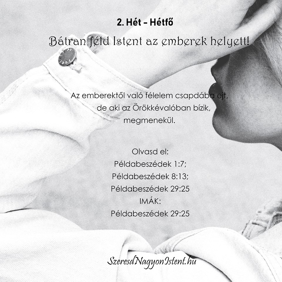 2. heti kihívás: Nevezz meg egy személyt vagy egy dolgot az életedben, amit Istennél jobban félsz. Tölts időt az Úrral, és ismerd fel, tudatosítsd magadban az Ő isteni tulajdonságait. Kérd az Ő segítségét, hogy át tudd adni Neki a félelmeidet.
