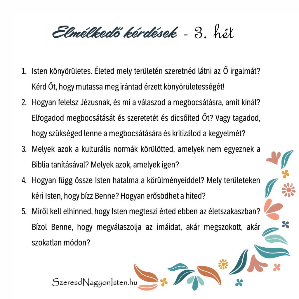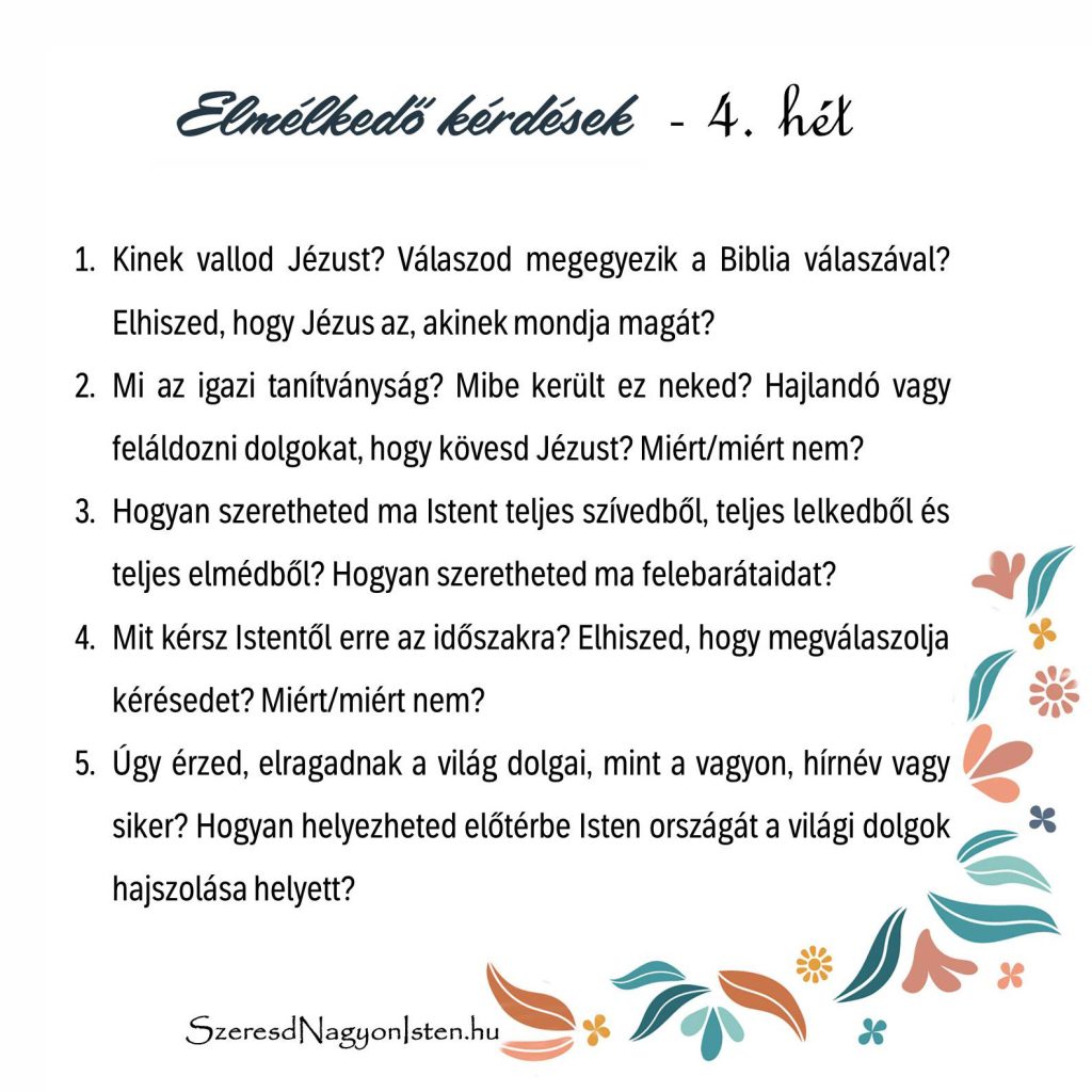 3. heti kihívás: Ezen a héten Jézus számos csodájáról olvashatunk. A tanítványok személyesen tanúi voltak ezeknek a csodáknak, a hitük mégis gyenge volt. A hét során őszintén mérd fel a hitedet! Kérd Istent, hogy fedje fel, hogy életed mely területein kellene erősödnie a hitednek és kérd Tőle, hogy erősítsen meg téged a Szentlélek erejével.
