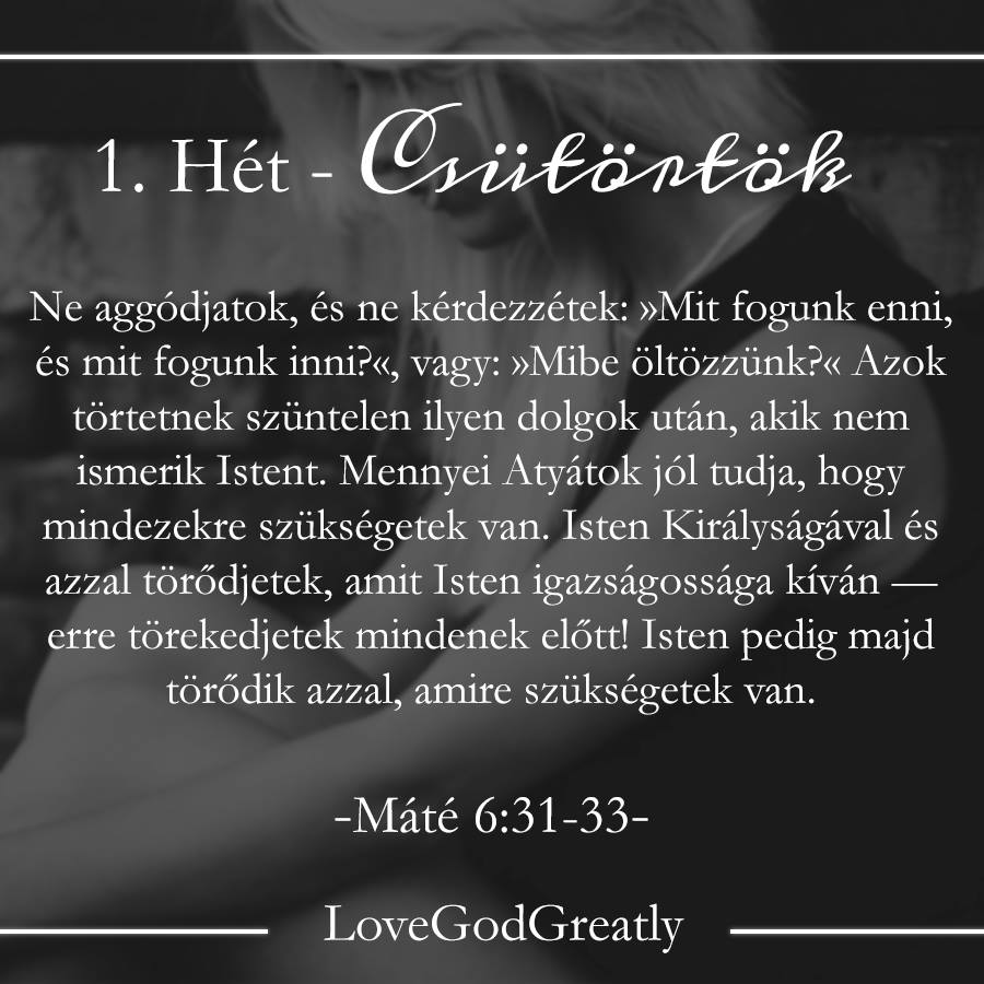 Mennyei Atyám, Te vagy az Alfa és az Omega, a kezdet és a vég, a hitünk kezdője és bevégzője. Arra lettünk teremtve, hogy imádjunk Téged. Bár néha a szívem eltévelyeg, Uram, és küszködöm azzal, hogy Téged keresselek először. Olyan sok más dolog és ember tölti be a szívemet és megrabolják az irántad való hódolatomat és elvonnak szeretetedtől. Uram, üresíts meg engem az anyagiakkal és az aggódással való foglalatosságtól. Vegyél el bármilyen bálványt a szívemből, ami elfoglalja a Te helyed a szívemben. Uram, bocsásd meg az önzőségem, az önközpontúságom, és az önmagamra irányuló tetteimet. Amikor nem tudok bízni benned a szükségeimet illetően, emlékeztess, hogy Te nagyobb vagy, mint a vágyaim, az aggodalmaim, a félelmeim, a kicsinyes terveim és ambícióim. Uram, emlékeztess, hogy a Te terved és vágyad számomra sokkal nagyobb, mint a sajátom, és hogy teljesen megbízhatom Benned. Jézus nevében, ámen.