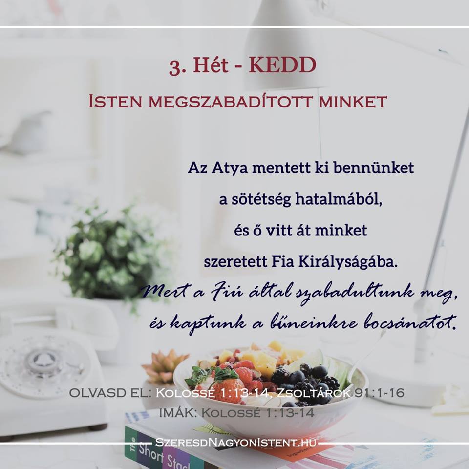 Mennyei Atyám, köszönöm Neked a Te feltétlen szeretetedet. Köszönöm, hogy Hozzád jöhetek akkor, amikor fáradtnak érzem magam és félek. Köszönöm, hogy megnyugodhatok abban a tudatban, hogy akármin megyek is keresztül, Te mindig fedezni fogsz engem. Dicsérlek Téged a Te szerető kegyelmedért. Köszönöm Neked azt a mindent elsöprő szabadítást, amit Jézusban kaptam Tőled. Jézus nevében, Ámen.