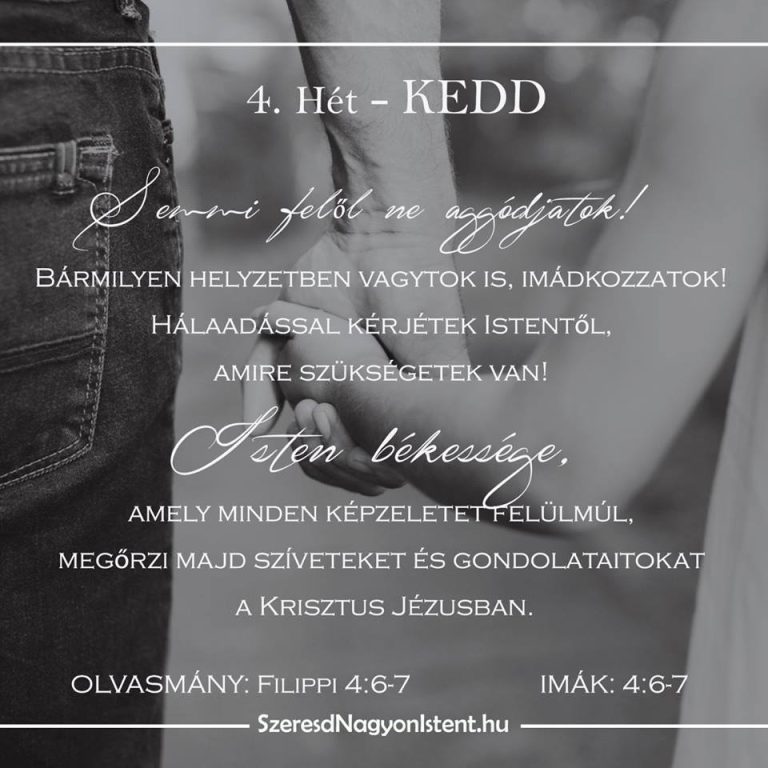 Amikor kislány voltam, emlékszem, megtanultam, hogy az aggodalmaimat imákká formáljam és hagyjam őket Jézus lábánál. Ez a lecke velem maradt egész életem során, és a mai napig rendszeresen visszatérek ehhez a gyakorlathoz. Világunk és az őrült idők, amiket élünk, bárkinek szorongást okoznak, de ekkor válik fontossá hitünk, bizalmunk, és imáink. Ahelyett, hogy engednénk, hogy e világ aggodalmai „leszívják” az energiánkat, Istenre kell bíznunk minden félelmünket. Imában átadjuk neki gondjainkat és aggodalmainkat, és bízunk Benne, hogy úgy fog munkálkodni, ahogyan csak Ő tud. Mi nem vagyunk Isten, de Ő igen, és Ő sokkal többet tud tenni, mint amit valaha is el tudnánk képzelni. Hálatelt szívvel azért, amit már megtett, átadjuk Neki aggodalmainkat és lehetőséget kínálunk, hogy munkálkodjon életünkben az Ő dicsőségére.