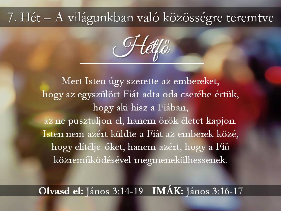 Eleged van ebből a világból? Megértem – nehéz dolog nézni napról napra a híreket úgy, hogy közben ne veszítse el az ember reményt az emberségben. Sok ember úgy áll hozzá manapság a dolgokhoz, hogy kifejlesztett magában egy vigyázok – kell – magamra hozzáállást, mert belefáradtak abba, hogy világítsanak egy ilyen sötét világban. Krisztus követőiként azonban imádkoznunk kell azért, hogy úgy lássuk a világot, ahogy Isten látja: szeretettel és együtt-érző szívvel azokért, akiknek összetörve és elveszett állapotban a Megváltóra van szükségük. Lehet, hogy először olvasod ezeket az igeverseket, lehet, hogy több százszor olvastad már őket ezelőtt. Bárhogy is legyen, meg tudnál állni most és tudnál imádkozni Istenhez, hogy adjon neked egy megújult látásmódot azzal kapcsolatban, hogy mennyire szereti ő a világot? Az emberiség kudarcot vallott, a világ Reménysége – Jézus – azonban eljött! Isten ANNYIRA szerette a világot, hogy elküldte a Fiát, hogy megmentsen bennünket. Isten nem adta fel a világot; nem fordult el, nem utasította vissza nagy-nagy szükségletünket. Ha igazán ismerjük Jézust, akkor mi sem adjuk fel a világot! Ezen a héten imádkozzunk azért, hogy Isten gyújtsa lángra szívünket, hogy szenvedélyesen próbáljuk meg kinyújtani kezünket a haldokló világ felé, mutassunk meg Krisztus iránti szeretetünket és szenvedélyünket a körülöttünk élőknek.