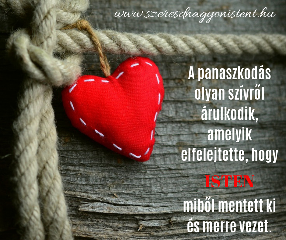 Amikor panaszkodunk, akkor ezzel azt fejezzük ki, hogy nincs ínyünkre, amit Isten az életünkre vagy az adott napunkra szánt. Azt mondjuk ezzel, hogy jobbat érdemlünk, ami viszont azt jelenti, hogy elfelejtettük, valójában mit is érdemelnénk. Bűneink miatt csak ítélet járna, de Isten lenyúlt értünk a mocsokba, és kihúzott. Jézus nemcsak a bűn hatalmából mentett ki, de Isten haragja elől is. De Isten nem áll meg itt. Napról napra munkálkodik az életünkben. Gyógyít, meglágyítja a szívünket, mindent összhangba hoz, hogy a javunkat munkálja. Mi viszont sajnos édeskeveset foglalkozunk vele, és megfeledkezünk róla.