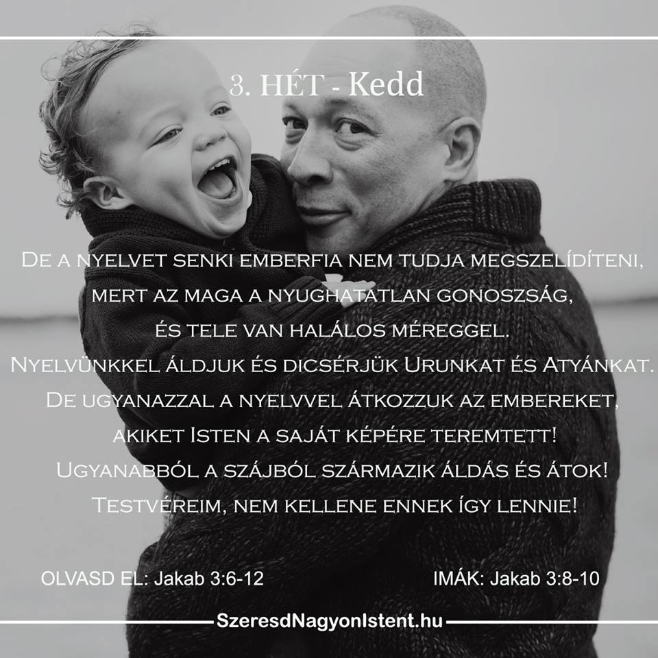 Mennyei Atyám, kérlek, vigyázz a nyelvemre! Segíts, hogy fékezni tudjam! Te adj nekem bölcsességet, és a Te ítélőképességedet, hogy tudjam, mikor kell szólnom, és mikor nem. Segíts, hogy a szavaim a Te szeretetedet tükrözzék, és hogy a Te neved dicsőüljön meg a bennem végzett munkádon keresztül. Jézus nevében kérlek, Ámen.
