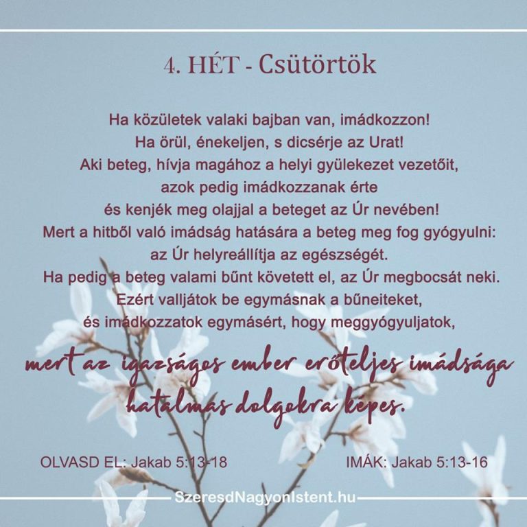 Mennyei Atyám, micsoda elképesztő és csodálatos kiváltság az, hogy bátran jöhetünk a Te kegyelmi trónusodhoz! Uram, kérlek, segíts az imát kitartóan fontossá tenni az életemben. Kérlek, növeld az étvágyam és a szomjam, hogy egy még közelebbi kapcsolatra vágyjak Veled! Emlékeztess, hogy az ima legyen az első reakcióm akár jó, akár rossz dolgok történnek velem. Jézus nevében kérlek, Ámen.
