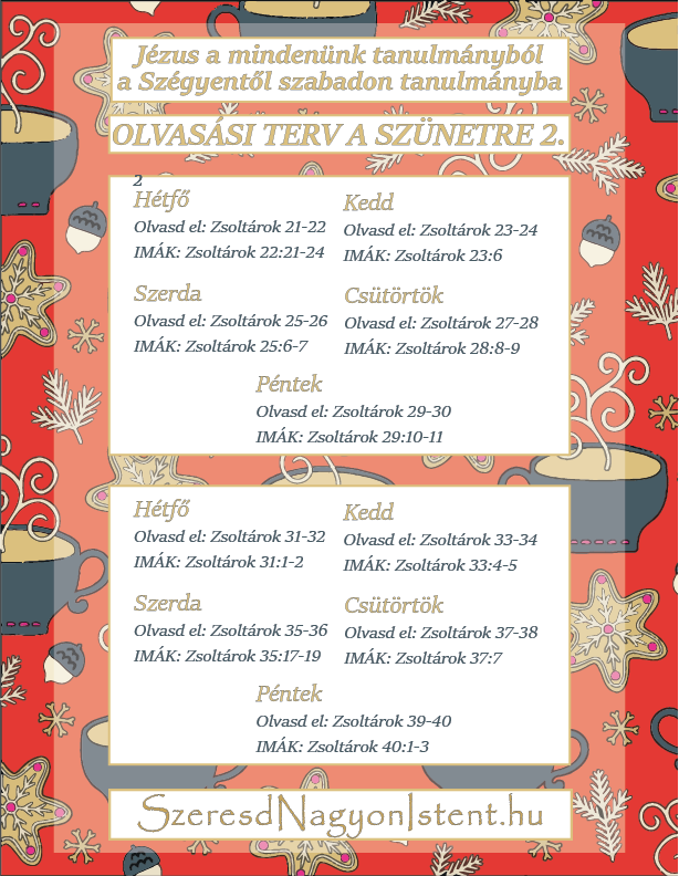 A szünet idejére két kéthetes olvasási tervet biztosítunk a folyamatos Bibliatanulmányozás érdekében mindazoknak, akik a pihenés alatt is szeretnék olvasni és tanulmányozni Isten Igéjét.