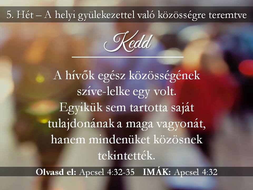 Szánjunk ma időt arra, hogy imádkozzunk a gyülekezetünkért. Imádkozzunk azért, hogy a Szent Szellem hozzon természetfeletti egységet a mi gyülekezetünkbe és kérjük Istent, hogy munkálkodjon a mi életünkben és azoknak az életében, akik gyülekezetünkbe járnak, segítsen nekünk mindannyiunknak nagylelkűnek lenni és felismerni, hogy minden, amink van, az Övé.