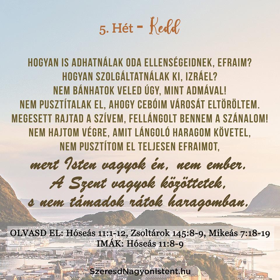 Olvasd el: Hóseás 11:1-12, Zsoltárok 145:8-9, Mikeás 7:18-19 IMÁK: Hóseás 11:8-9 Ma olyan szerető Atyaként látjuk Istent, aki annyira szerette Izráelt, mint egy gyermeket, Aki kihívta fiát Egyiptomból. Megtanította Efraimot járni, karjaiban hordozta. Lehajolt hozzá és táplálta. Isten mindig jó, szerető, törődő Atya volt. De jön a büntetés Izráel bűnei miatt. Lerohanják őket az asszírok […]
