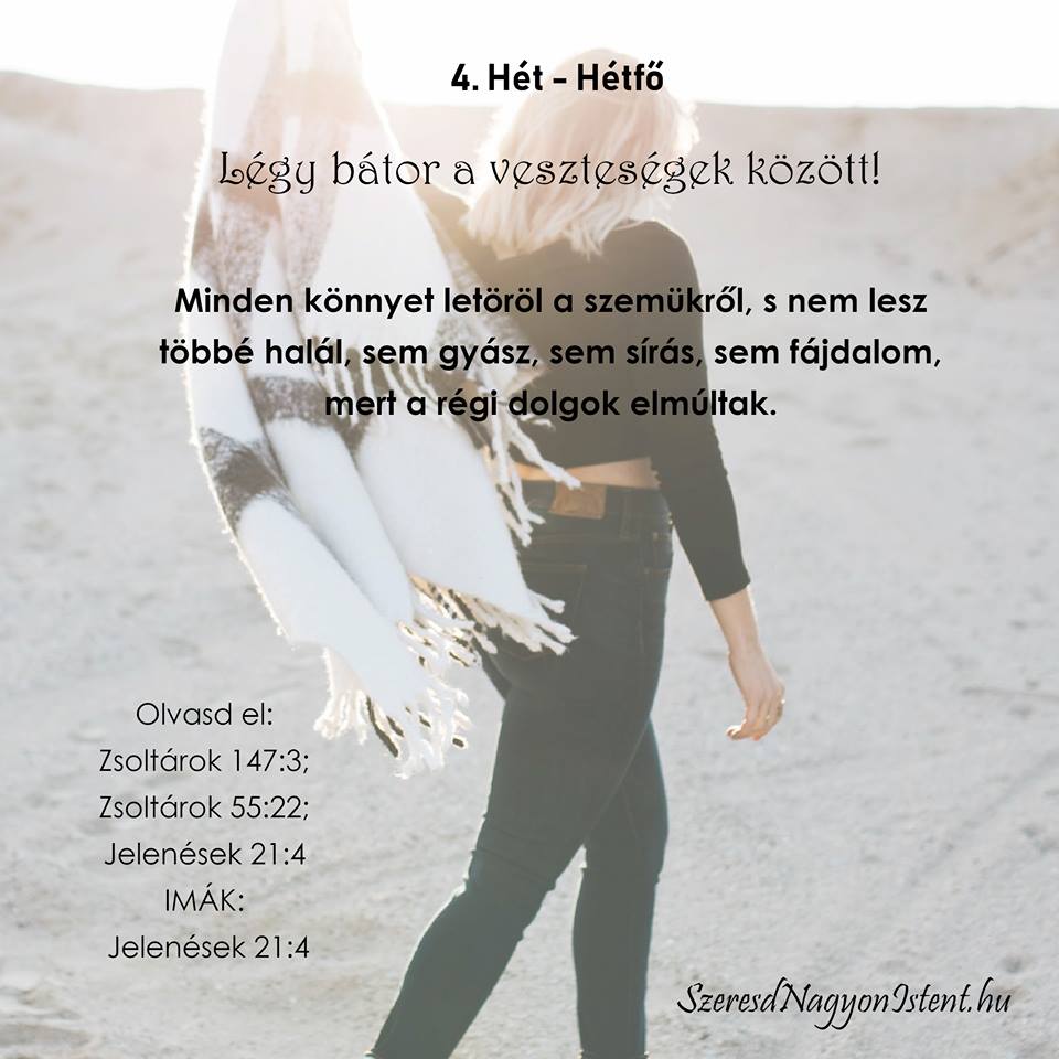 Mennyei Atyám, köszönöm, hogy megígérted nekünk a Mennyet. Add, hogy Igéd alapján mindig reménységgel tekintsek előre. Köszönöm Uram a bátorságot, mellyel elviselhetem a veszteséget és a szomorúságot, miközben a Veled töltendő örökkévalóságon tartom a tekintetemet. Ámen.