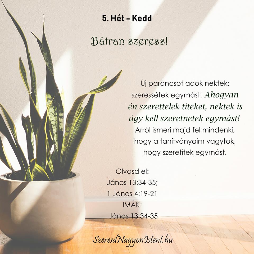 A szeretet bátorrá tesz. Szeretve lenni és tudni, hogy szeretnek, az egyik leghatalmasabb megerősítő érzés. Ettől úgy érezzük, hogy be tudnánk venni a világot! De másokat úgy szeretni, ahogyan Jézus minket szeret, ahogy megparancsolta nekünk, bátorságot igényel. Mások szeretete nehéz tud lenni. Önzetlenséget, áldozatot, alázatot és sebezhetőséget igényel. De pontosan ez az a hely, ahova Jézus állítani akar minket: teljesen az Ő szeretetébe és teljességgel egymás szeretetébe. Ezen keresztül veszi észre a világ, hogy mi az Ő gyermekei vagyunk, mert csakis Krisztussal ismerhetjük a szeretetnek ezt a szintjét. Csakis Krisztussal lehetünk elég bátrak, hogy úgy szeressük egymást, ahogyan Ő szeret minket. Az Ő szeretete bátorrá tesz minket.